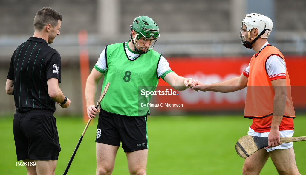 6 September 2020; Lucan Sarsfields captain Johnny McCaffrey fist bumps with Cuala captain Darragh O'Connell before referee Seán Stack performed the coin toss prior to the Dublin County Senior Hurling Championship Semi-Final match between Lucan Sarsfields and Cuala at Parnell Park in Dublin. Photo by Piaras Ó Mídheach/Sportsfile