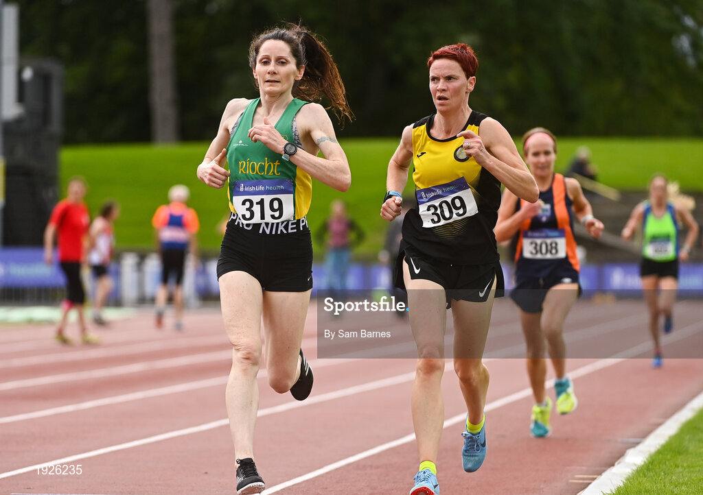 6 September 2020; Suzanne Neilan of An Ríocht AC, Kerry, left, competing in the F45 Women's 3000m and Karen Costello of Dunleer AC, Louth, competing in the F40 Women's 3000m event during the Irish Life Health National Masters Track and Field Championships at Morton Stadium in Santry, Dublin. Photo by Sam Barnes/Sportsfile