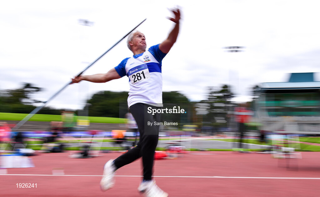 6 September 2020; Denis Delany of Dunboyne AC, Meath, competing in the M50 Men's Javelin event during the Irish Life Health National Masters Track and Field Championships at Morton Stadium in Santry, Dublin. Photo by Sam Barnes/Sportsfile