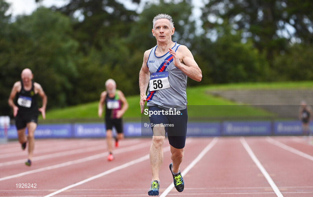 6 September 2020; Shane Sheridan of Dundrum South Dublin AC, competing in the M60 Men's 200m event during the Irish Life Health National Masters Track and Field Championships at Morton Stadium in Santry, Dublin. Photo by Sam Barnes/Sportsfile