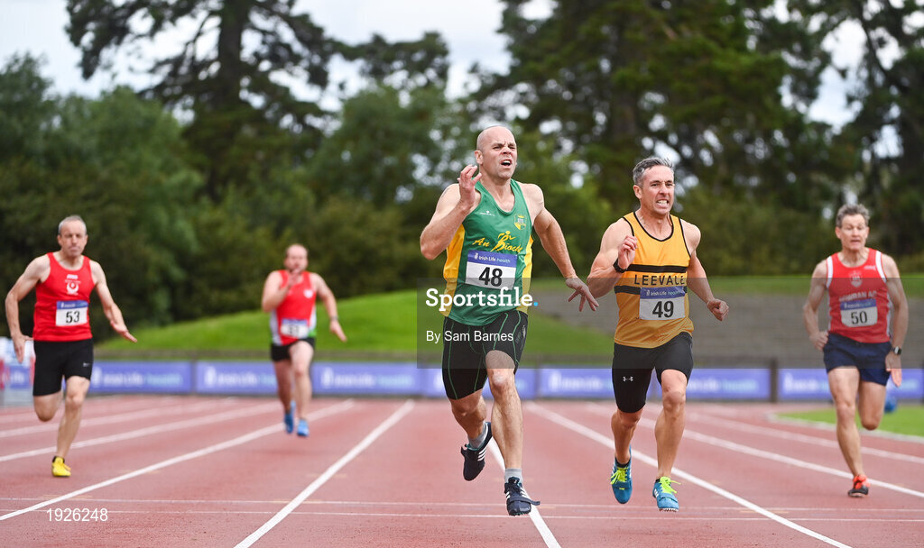 6 September 2020; Anthony Greaney of An Ríocht AC, Kerry, 48, and Garrett Flynn of Leevale AC, Cork, 49, competing in the M45 Men's 200m event during the Irish Life Health National Masters Track and Field Championships at Morton Stadium in Santry, Dublin. Photo by Sam Barnes/Sportsfile