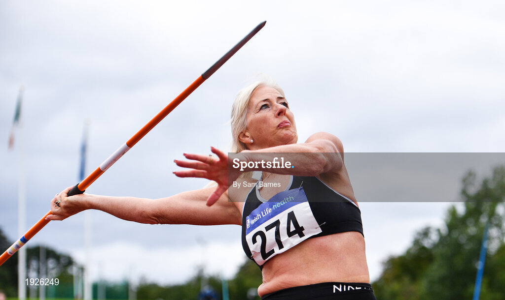 6 September 2020; Geraldine Finegan of North East Runners AC, competing in the F50 Women's Javelin event during the Irish Life Health National Masters Track and Field Championships at Morton Stadium in Santry, Dublin. Photo by Sam Barnes/Sportsfile
