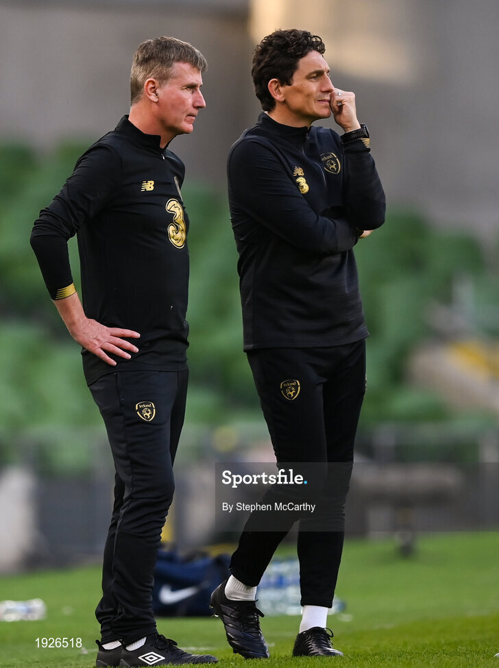 6 September 2020; Republic of Ireland manager Stephen Kenny, left, and coach Keith Andrews react following the UEFA Nations League B match between Republic of Ireland and Finland at the Aviva Stadium in Dublin. Photo by Stephen McCarthy/Sportsfile