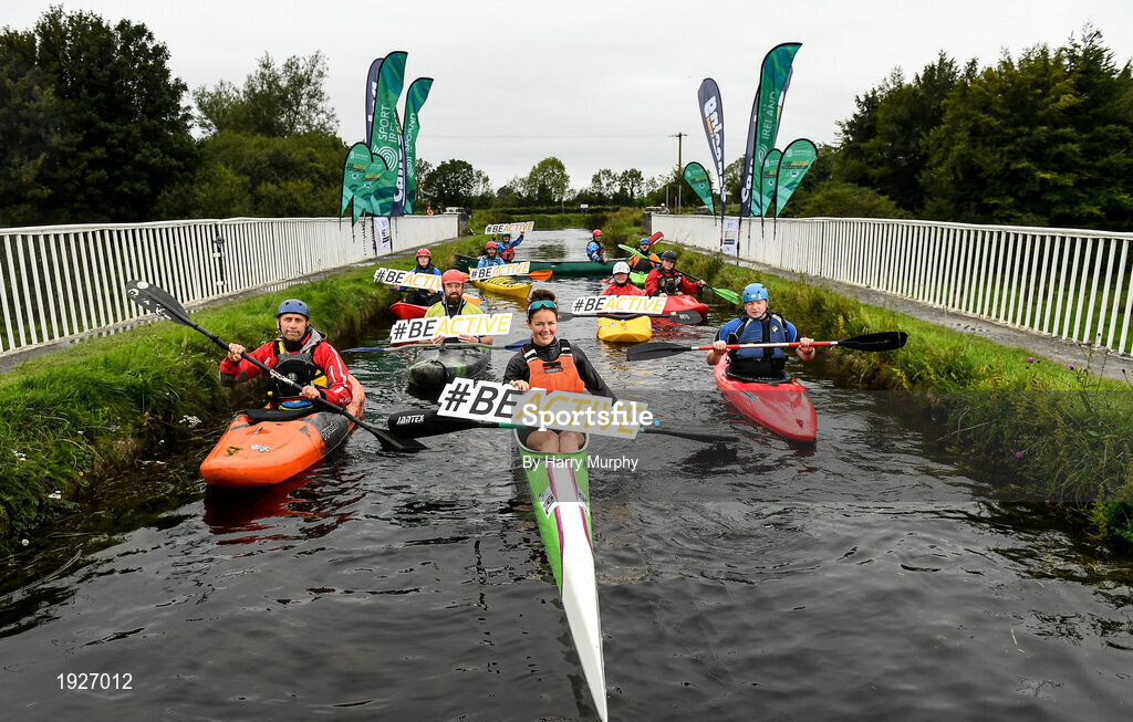 15 September 2020; Irish sprint canoeist Jenny Egan, centre, pictured with Paul Ashmore, Lee Harding and Eoghan O'Huallachain of Monasterevin Blueway Kayak Club, Special Olympics Canoeing Medallist Oisin Feery, Bridge the Gap and Women in Sport Ambassador Jessica Flinter, Kildare Sports Hub Coordinator Debora Foley, Mark Hoare of UCD Kayak Club, Canoeing Ireland Training Centre Instructor Graham Connor, Lynda Byron Board of Canoeing Ireland and Canoeing Ireland CEO Moira Aston at the launch of the #BeActive Paddle day at Monasterevin on the Grand Canal in Kildare. For the European Week of Sport (23rd-30th September), Canoeing Ireland, in partnership with Sport Ireland, wants to get people out and active on the water. The #BeActive Paddle Day takes place on Saturday, 26th September, with over 30 Canoeing Ireland affiliated clubs and Outdoor Education Centres across the country hosting beginner sessions for the public in their area to come and try paddlesports. Further event details and a map of nationwide locations are available on the Canoeing Ireland website at canoe.ie. Photo by Harry Murphy/Sportsfile