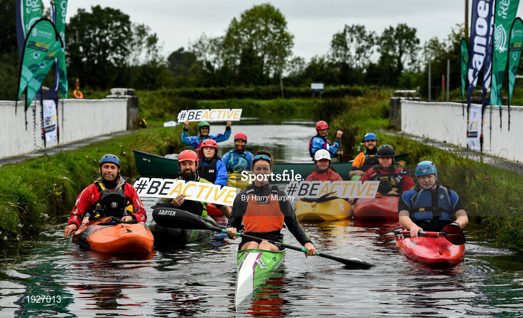15 September 2020; Irish sprint canoeist Jenny Egan, centre, pictured with Paul Ashmore, Lee Harding and Eoghan O'Huallachain of Monasterevin Blueway Kayak Club, Special Olympics Canoeing Medallist Oisin Feery, Bridge the Gap and Women in Sport Ambassador Jessica Flinter, Kildare Sports Hub Coordinator Debora Foley, Mark Hoare of UCD Kayak Club, Canoeing Ireland Training Centre Instructor Graham Connor, Lynda Byron Board of Canoeing Ireland and Canoeing Ireland CEO Moira Aston at the launch of the #BeActive Paddle day at Monasterevin on the Grand Canal in Kildare. For the European Week of Sport (23rd-30th September), Canoeing Ireland, in partnership with Sport Ireland, wants to get people out and active on the water. The #BeActive Paddle Day takes place on Saturday, 26th September, with over 30 Canoeing Ireland affiliated clubs and Outdoor Education Centres across the country hosting beginner sessions for the public in their area to come and try paddlesports. Further event details and a map of nationwide locations are available on the Canoeing Ireland website at canoe.ie. Photo by Harry Murphy/Sportsfile