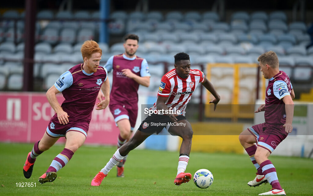 29 August 2020; Ibrahim Meite of Derry City in action against Hugh Douglas, left, and Derek Prendergast of Drogheda United during the Extra.ie FAI Cup Second Round match between Drogheda United and Derry City at United Park in Drogheda, Louth. Photo by Stephen McCarthy/Sportsfile