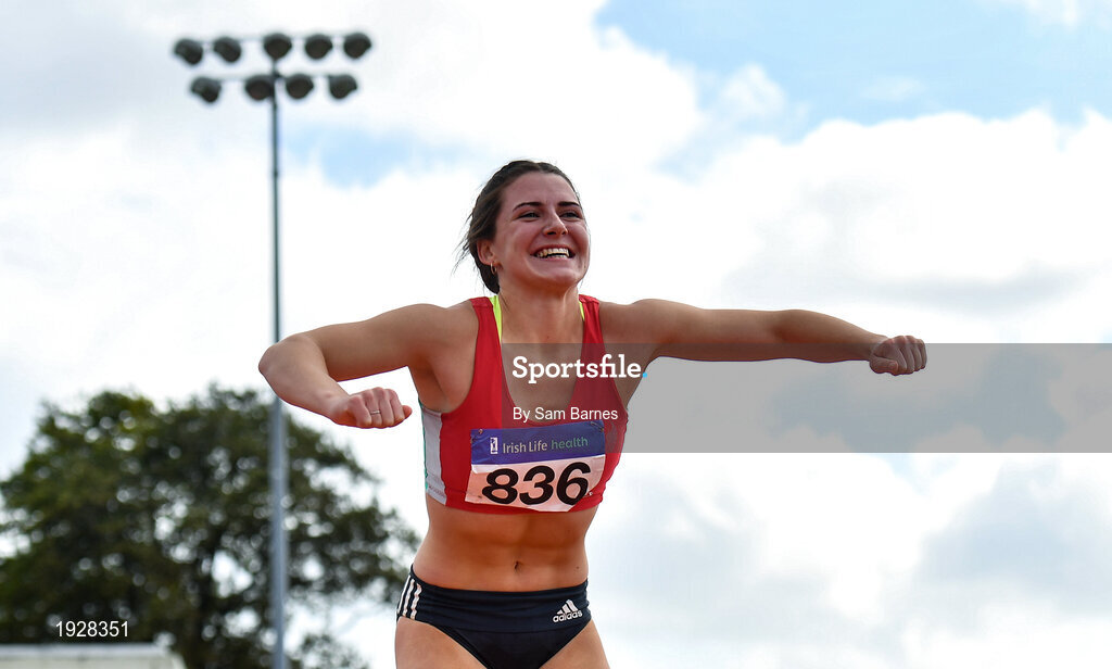 12 September 2020; Anna McCauley of City of Lisburn AC, Down, celebrates a clearance whilst competing in the High Jump event of the Senior Women's Heptathlon during day one of the Irish Life Health Combined Event Championships at Morton Stadium in Santry, Dublin. Photo by Sam Barnes/Sportsfile