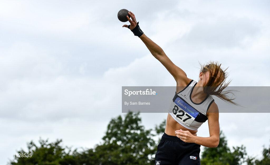 12 September 2020; Lara O'Byrne of Donore Harriers, Dublin, competing in the Shot Put event of the Senior Women's Heptathlon during day one of the Irish Life Health Combined Event Championships at Morton Stadium in Santry, Dublin. Photo by Sam Barnes/Sportsfile