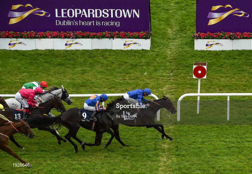 12 September 2020; Halimi, with Kevin Manning up, passes the post ahead of second place Shoshone Warrior, with Wayne Lordan up, to win the Irish Stallion Farms EBF 'Petingo' Handicap during day one of The Longines Irish Champions Weekend at Leopardstown Racecourse in Dublin. Photo by Seb Daly/Sportsfile
