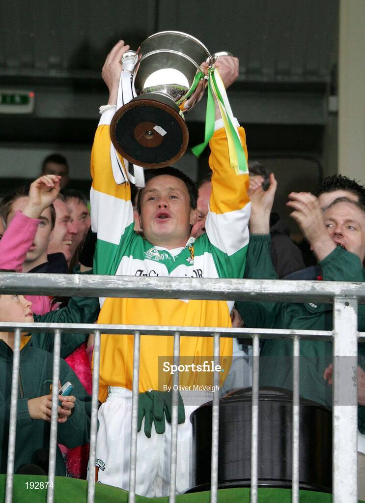 23 October 2005; Carrickmore captain Brian Gormley lifts the O'Neill Cup after victory over Omagh. Tyrone Senior Football Championship Final, Omagh v Carrickmore, Healy Park Omagh, Co. Tyrone. Picture credit: Oliver McVeigh / SPORTSFILE