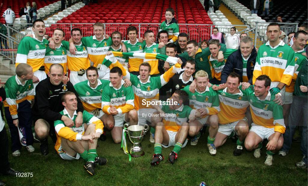 23 October 2005; The Carrickmore panel celebrate with the O'Neill Cup after victory over Omagh. Tyrone Senior Football Championship Final, Omagh v Carrickmore. Omagh, Co. Tyrone. Picture credit: Oliver McVeigh / SPORTSFILE