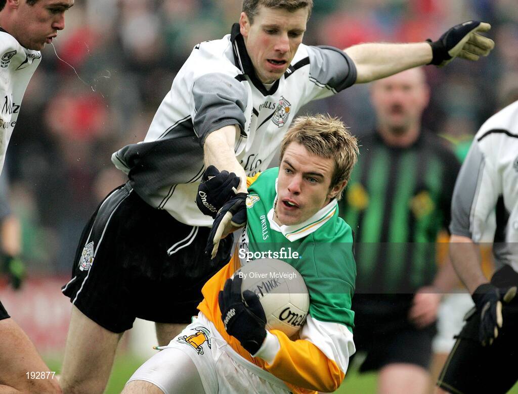 23 October 2005; Finbar Magill, Carrickmore, in action against David McKenna, Omagh. Tyrone Senior Football Championship Final, Omagh v Carrickmore. Omagh, Co. Tyrone. Picture credit: Oliver McVeigh / SPORTSFILE