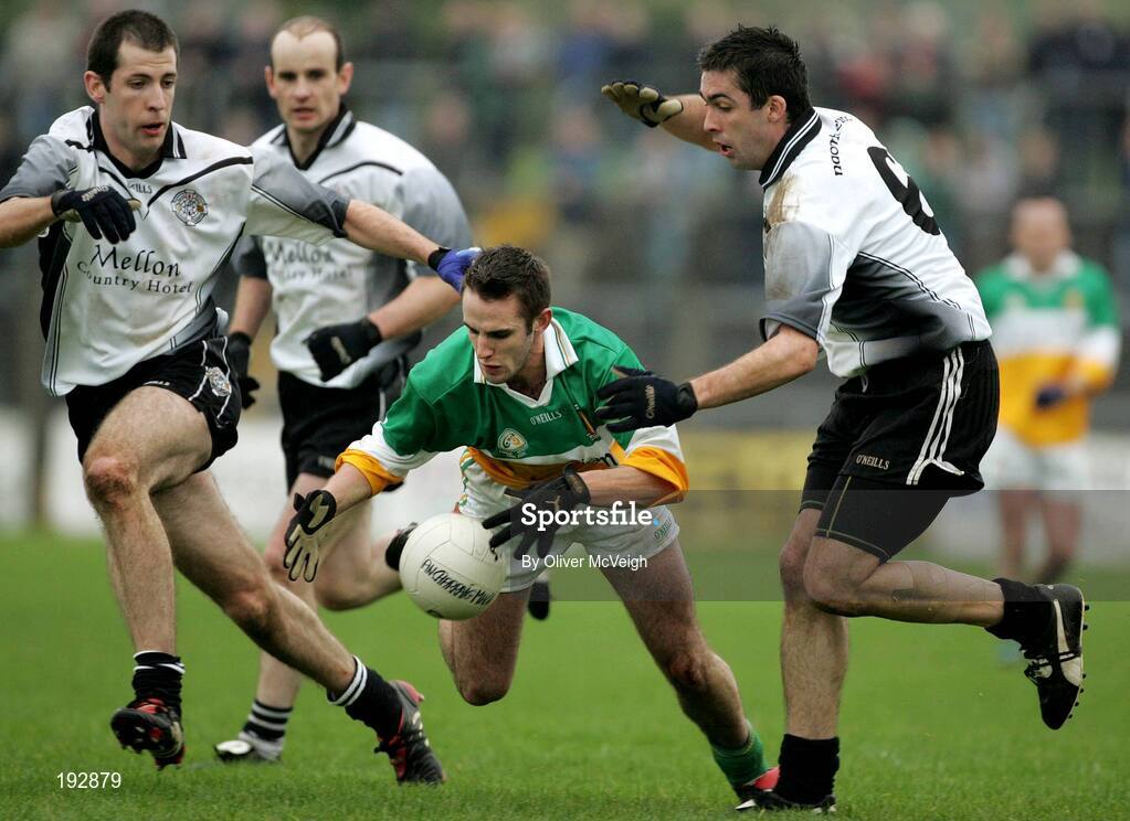 23 October 2005; Mark Donnelly, Carrickmore, under pressure from the Mc Mahon brothers Patrick and Joe, Omagh. Tyrone Senior Football Championship Final, Omagh v Carrickmore. Omagh, Co. Tyrone. Picture credit: Oliver McVeigh / SPORTSFILE