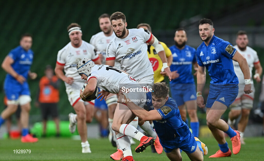 12 September 2020; Michael Lowry of Ulster is tackled by Garry Ringrose of Leinster during the Guinness PRO14 Final match between Leinster and Ulster at the Aviva Stadium in Dublin. Photo by Ramsey Cardy/Sportsfile