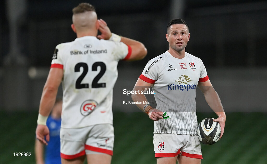 12 September 2020; John Cooney of Ulster speaks to team-mate Ian Madigan during the Guinness PRO14 Final match between Leinster and Ulster at the Aviva Stadium in Dublin. Photo by Brendan Moran/Sportsfile