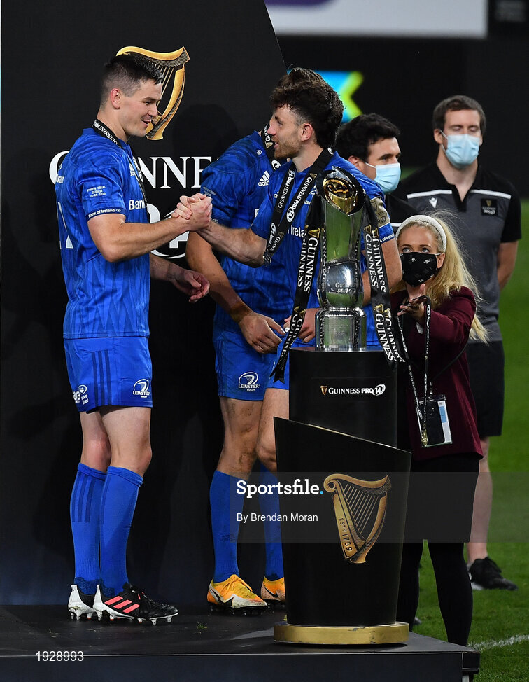 12 September 2020; Jonathan Sexton of Leinster presents team-mate James Lowe with his winners medal after the Guinness PRO14 Final match between Leinster and Ulster at the Aviva Stadium in Dublin. Photo by Brendan Moran/Sportsfile