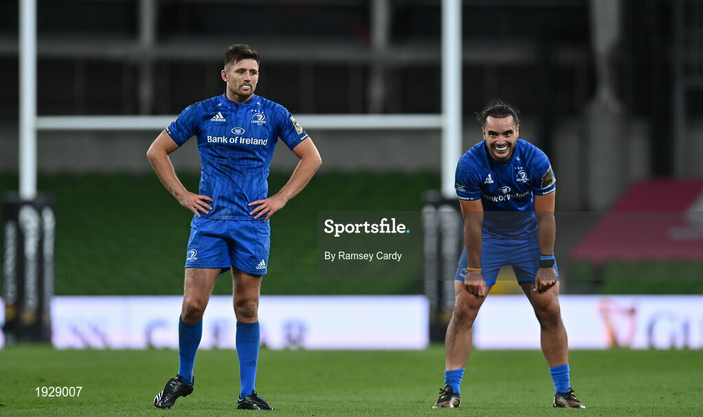 12 September 2020; Ross Byrne, left, and James Lowe of Leinster during the Guinness PRO14 Final match between Leinster and Ulster at the Aviva Stadium in Dublin. Photo by Ramsey Cardy/Sportsfile