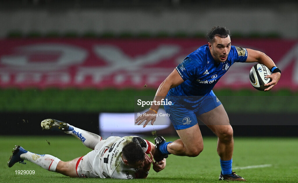 12 September 2020; James Lowe of Leinster is tackled by John Cooney of Ulster during the Guinness PRO14 Final match between Leinster and Ulster at the Aviva Stadium in Dublin. Photo by Ramsey Cardy/Sportsfile