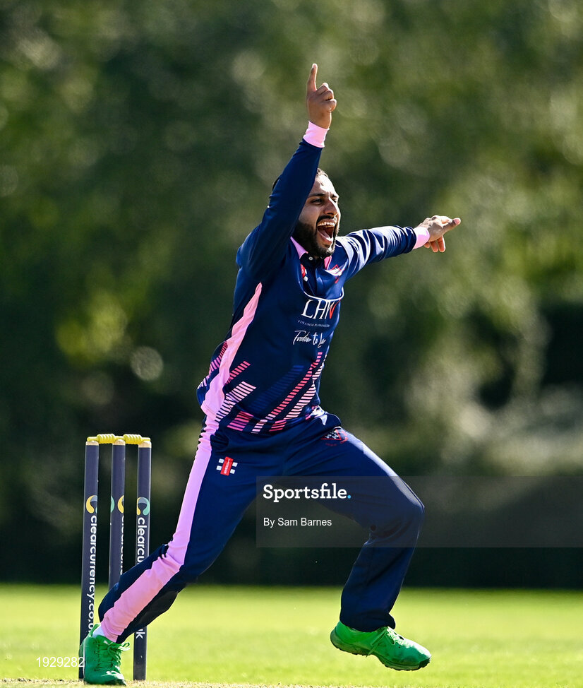 13 September 2020; Simi Singh of YMCA celebrates the wicket of Harvey Wootton of Cork County during the All-Ireland T20 Semi-Final match between YMCA and Cork County at Pembroke Cricket Club in Dublin. Photo by Sam Barnes/Sportsfile