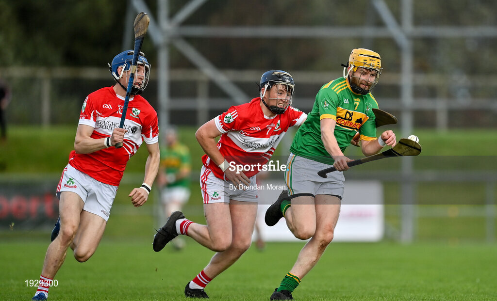13 September 2020; Phelim Duffin of Dunloy races clear of James McNaughton, left, and Declan mcCloskey of Loughgiel during the Antrim County Senior Hurling Championship Final match between Dunloy Cuchullains and Loughgiel Shamrocks at Páirc Mhic Uilín in Ballycastle, Antrim. Photo by Brendan Moran/Sportsfile