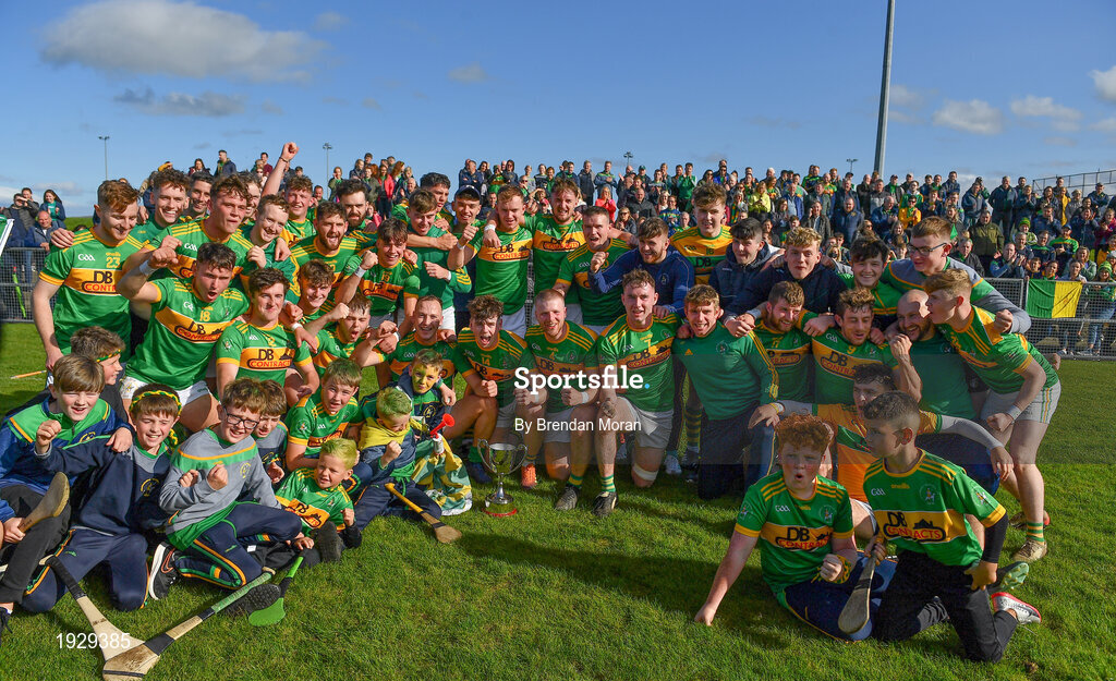 13 September 2020; The Dunloy team celebrate with the cup after the Antrim County Senior Hurling Championship Final match between Dunloy Cuchullains and Loughgiel Shamrocks at Páirc Mhic Uilín in Ballycastle, Antrim. Photo by Brendan Moran/Sportsfile