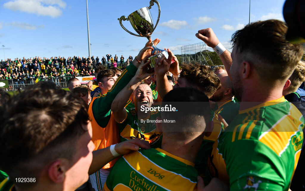 13 September 2020; Dunloy captain Paul Shiels, centre, and his team-mates celebrate with the cup after the Antrim County Senior Hurling Championship Final match between Dunloy Cuchullains and Loughgiel Shamrocks at Páirc Mhic Uilín in Ballycastle, Antrim. Photo by Brendan Moran/Sportsfile
