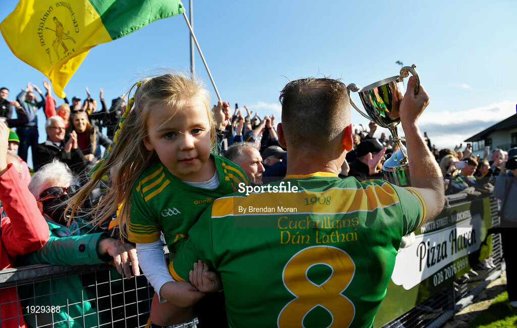 13 September 2020; Dunloy captain Paul Shields, carrying his daughter Ada, celebrates with the cup after the Antrim County Senior Hurling Championship Final match between Dunloy Cuchullains and Loughgiel Shamrocks at Páirc Mhic Uilín in Ballycastle, Antrim. Photo by Brendan Moran/Sportsfile