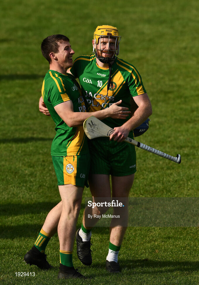 13 September 2020; Cathal Lenihan, left, and Aian Fawl of O'Callaghan's Mills celebrate after the Clare County Senior Hurling Championship Semi-Final match between Ballyea and O'Callaghan's Mills at Cusack Park in Ennis, Clare. Photo by Ray McManus/Sportsfile