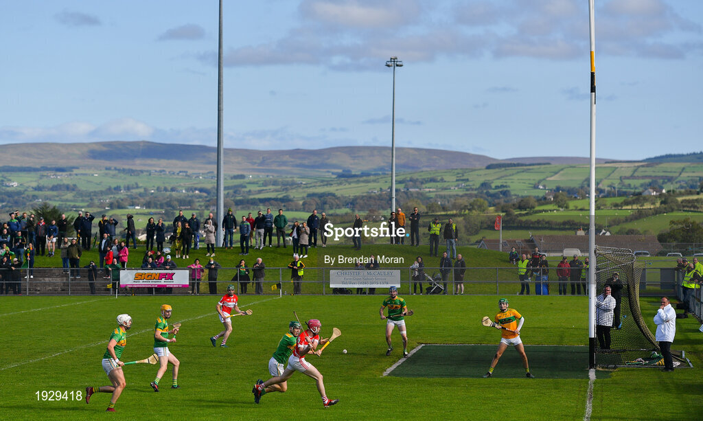 13 September 2020; Shan McGrath of Loughgiel in action against Paul Shields of Dunloy during the Antrim County Senior Hurling Championship Final match between Dunloy Cuchullains and Loughgiel Shamrocks at Páirc Mhic Uilín in Ballycastle, Antrim. Photo by Brendan Moran/Sportsfile