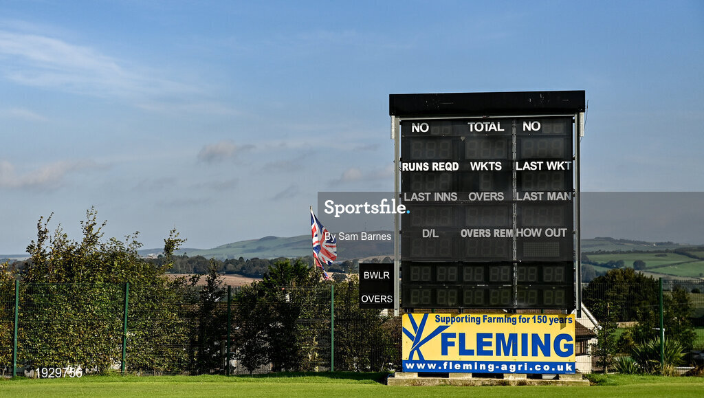 15 September 2020; A general view of the blank scoreboard after the Test Triangle Inter-Provincial Series 2020 match between North-West Warriors and Northern Knights is abandoned at Bready Cricket Club in Magheramason, Tyrone. Photo by Sam Barnes/Sportsfile