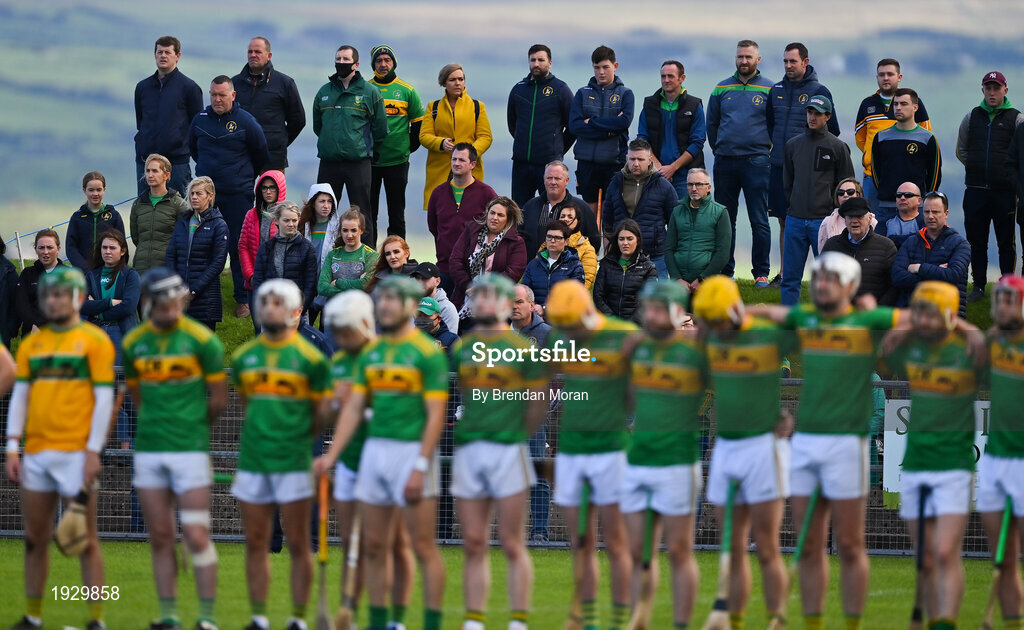13 September 2020; Dunloy supporters stand behind their team for Amhrán na bhFiann prior to the Antrim County Senior Hurling Championship Final match between Dunloy Cuchullains and Loughgiel Shamrocks at Páirc Mhic Uilín in Ballycastle, Antrim. Photo by Brendan Moran/Sportsfile