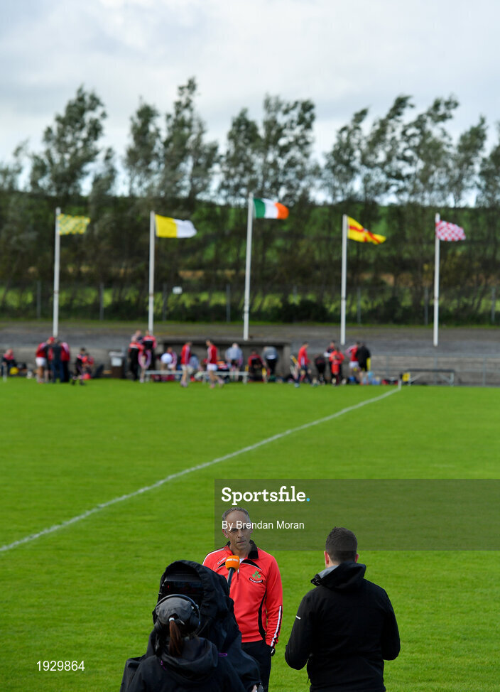 13 September 2020; Loughgiel Shamrocks manager Hugh McCann is interviewed by TG4 prior to the A the Antrim County Senior Hurling Championship Final match between Dunloy Cuchullains and Loughgiel Shamrocks at Páirc Mhic Uilín in Ballycastle, Antrim. Photo by Brendan Moran/Sportsfile