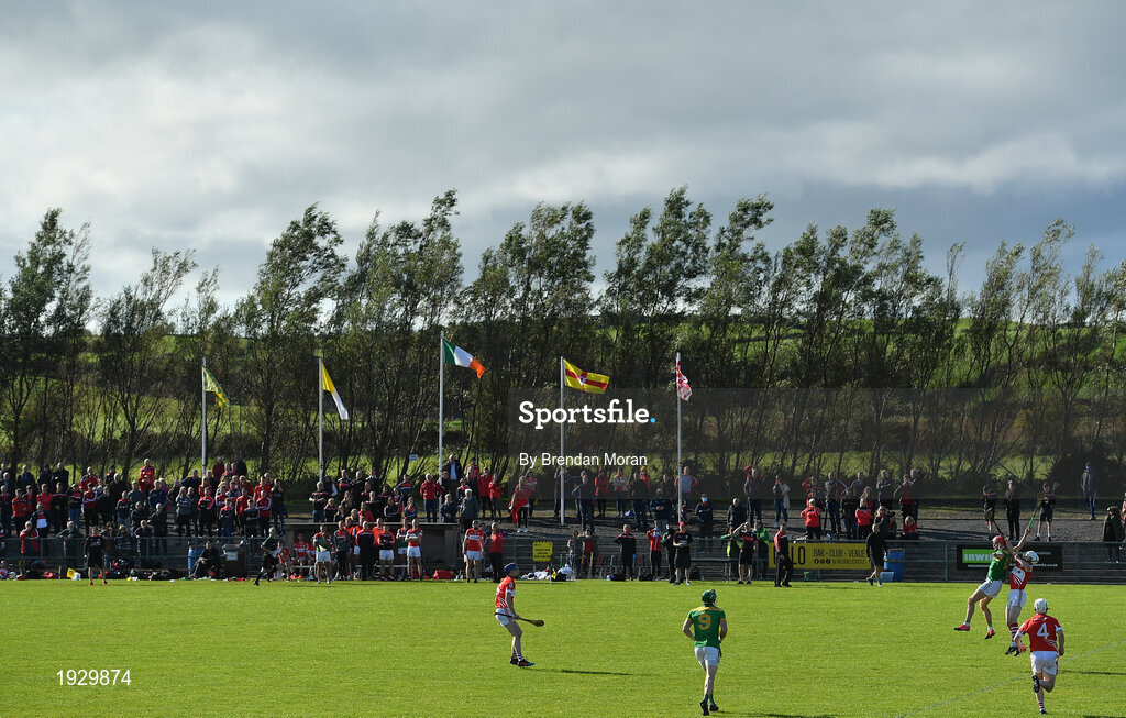 13 September 2020; Eoin O'Neill of Dunloy contests a dropping ball with Tiernan Coyle of Loughgiel during the Antrim County Senior Hurling Championship Final match between Dunloy Cuchullains and Loughgiel Shamrocks at Páirc Mhic Uilín in Ballycastle, Antrim. Photo by Brendan Moran/Sportsfile
