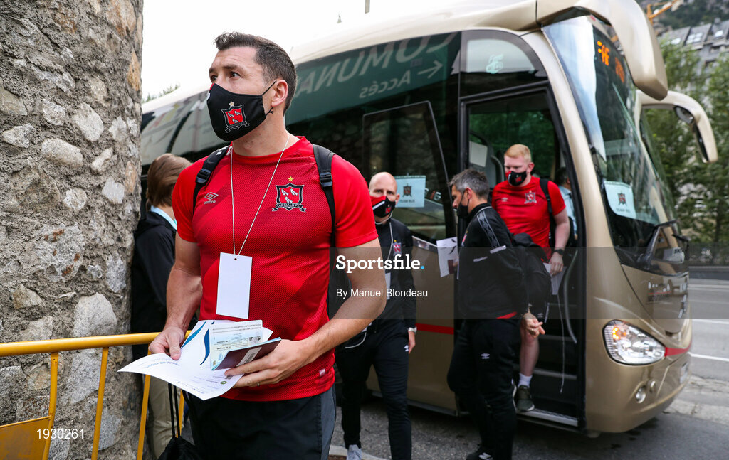 17 September 2020; Brian Gartland of Dundalk arrives with team-mates, with their medical certificate and passport in hand, ahead of the UEFA Europa League Second Qualifying Round match between Inter Escaldes and Dundalk at Estadi Comunal d'Andorra la Vella in Andorra. Photo by Manuel Blondeau/Sportsfile