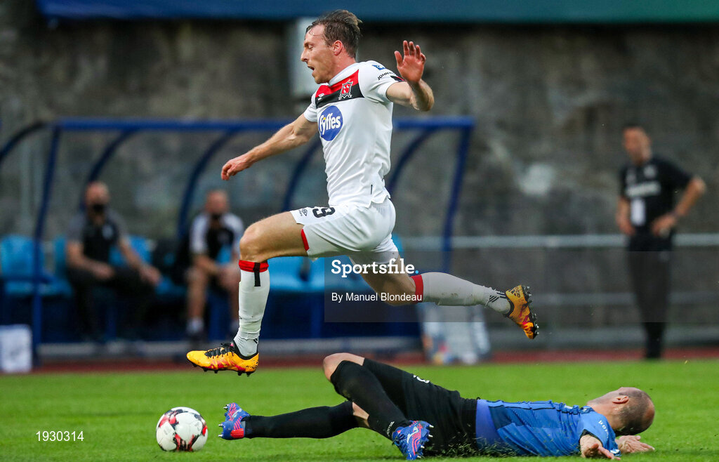 17 September 2020; David McMillan of Dundalk in action against ldefons Lima of Inter Escaldes during the UEFA Europa League Second Qualifying Round match between Inter Escaldes and Dundalk at Estadi Comunal d'Andorra la Vella in Andorra. Photo by Manuel Blondeau/Sportsfile