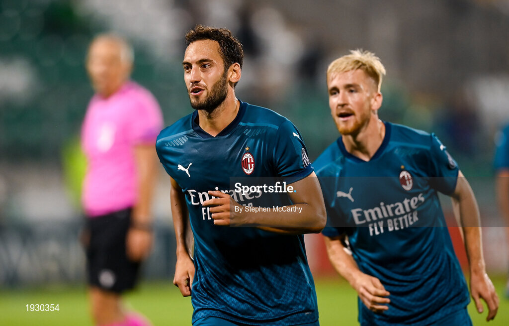 17 September 2020; Hakan Çalhanoglu of AC Milan celebrates after scoring his side's second goal with team-mate Alexis Saelemaekers, right, during the UEFA Europa League Second Qualifying Round match between Shamrock Rovers and AC Milan at Tallaght Stadium in Dublin. Photo by Stephen McCarthy/Sportsfile