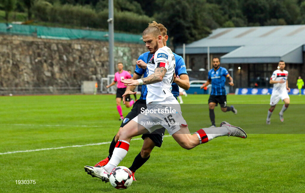 17 September 2020; Sean Murray of Dundalk in action against Raul Mihai Feher of Inter Escaldes during the UEFA Europa League Second Qualifying Round match between Inter Escaldes and Dundalk at Estadi Comunal d'Andorra la Vella in Andorra. Photo by Manuel Blondeau/Sportsfile