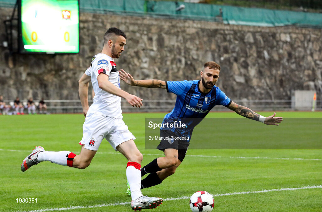 17 September 2020; Michael Duffy of Dundalk in action against Jordi Rubio of Inter Escaldes during the UEFA Europa League Second Qualifying Round match between Inter Escaldes and Dundalk at Estadi Comunal d'Andorra la Vella in Andorra. Photo by Manuel Blondeau/Sportsfile