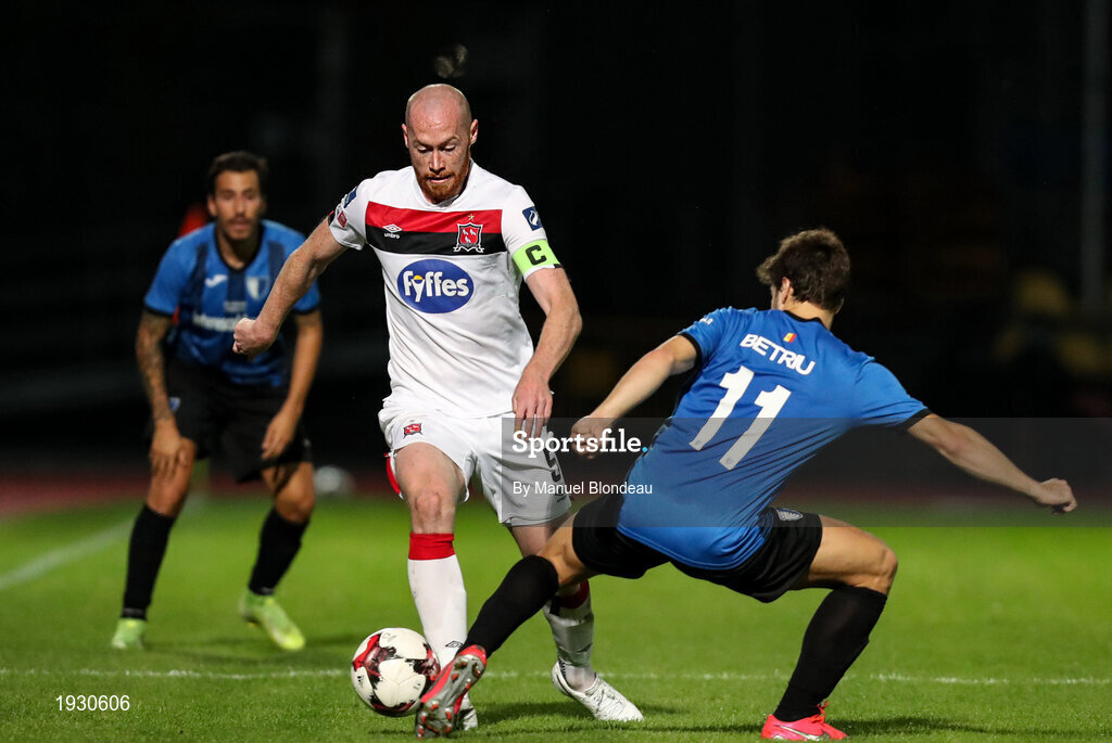 17 September 2020; Chris Shields of Dundalk in action against Betriu Armengol of Inter Escaldes during the UEFA Europa League Second Qualifying Round match between Inter Escaldes and Dundalk at Estadi Comunal d'Andorra la Vella in Andorra. Photo by Manuel Blondeau/Sportsfile