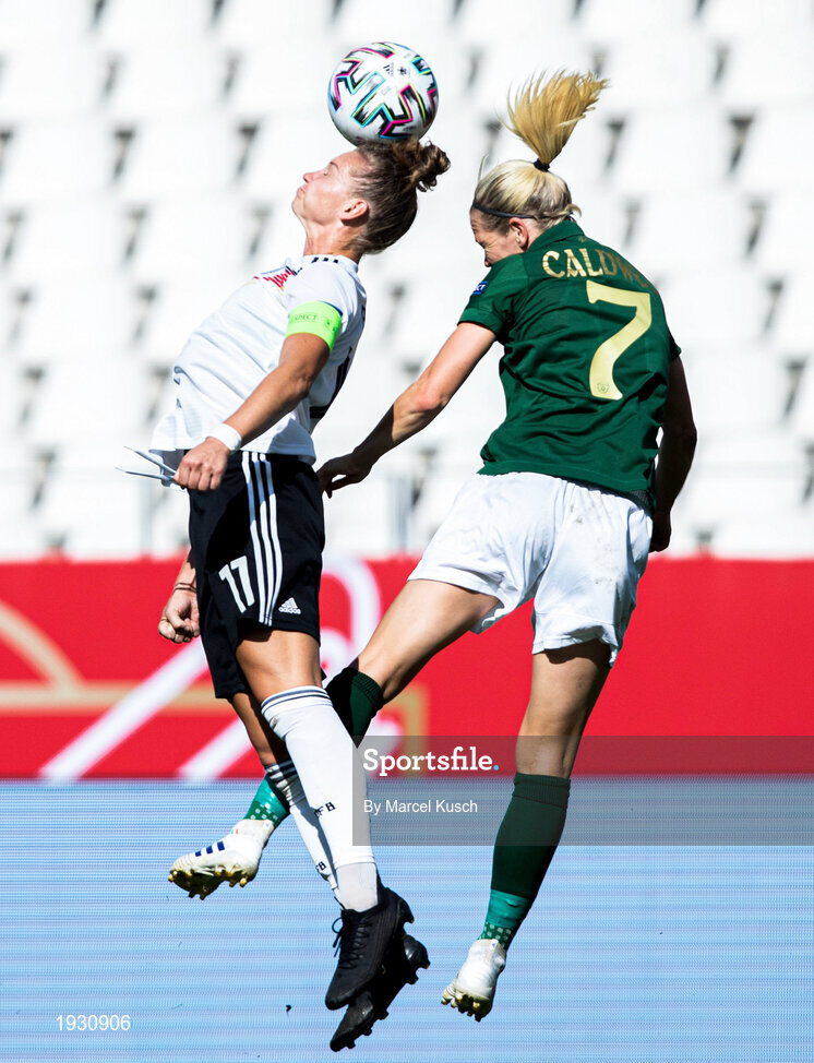 19 September 2020; Diane Caldwell of Republic of Ireland in action against Felicitas Rauch of Germany during the UEFA Women's 2021 European Championships Qualifier Group I match between Germany and Republic of Ireland at Stadion Essen in Essen, Germany. Photo by Marcel Kusch/Sportsfile