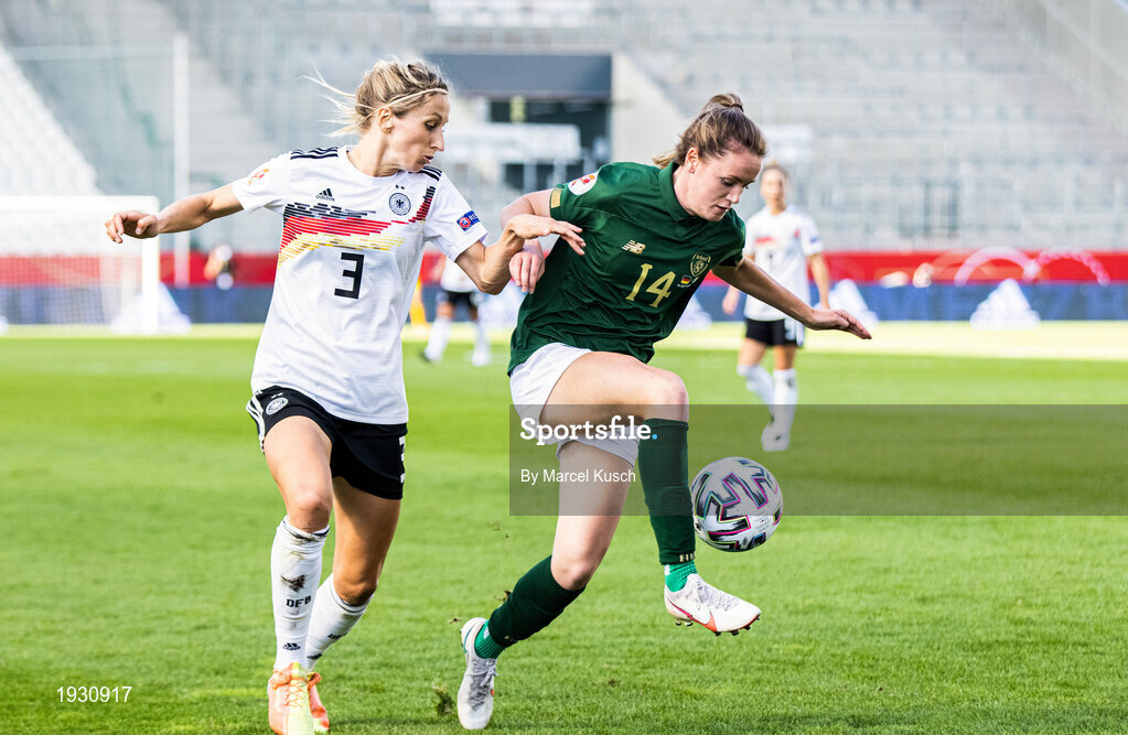19 September 2020; Heather Payne of Republic of Ireland in action against Kathrin-Julia Hendrich of Germany during the UEFA Women's 2021 European Championships Qualifier Group I match between Germany and Republic of Ireland at Stadion Essen in Essen, Germany. Photo by Marcel Kusch/Sportsfile