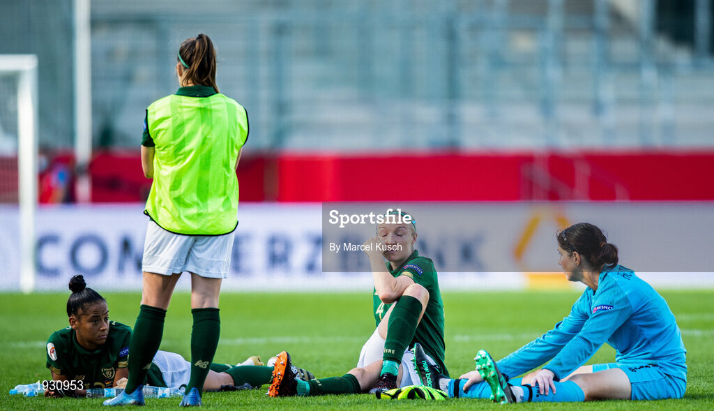 19 September 2020; Dejected Republic of Ireland players, from left, Rianna Jarrett, Louise Quinn and goalkeeper Marie Hourihan following their side's defeat in the UEFA Women's 2021 European Championships Qualifier Group I match between Germany and Republic of Ireland at Stadion Essen in Essen, Germany. Photo by Marcel Kusch/Sportsfile