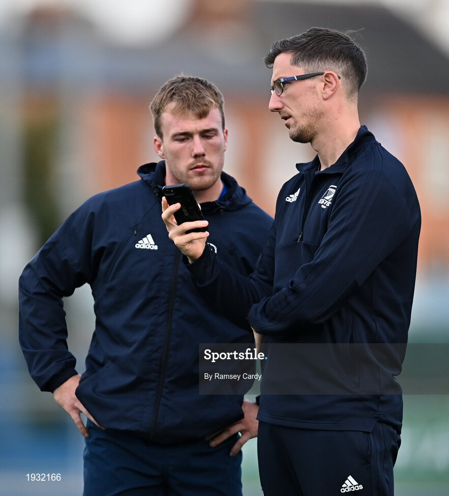 22 September 2020; Academy physiotherapist Darragh Curley, right, in conversation with David Hawkshaw during a Leinster Rugby Academy training session at Energia Park in Dublin. Photo by Ramsey Cardy/Sportsfile