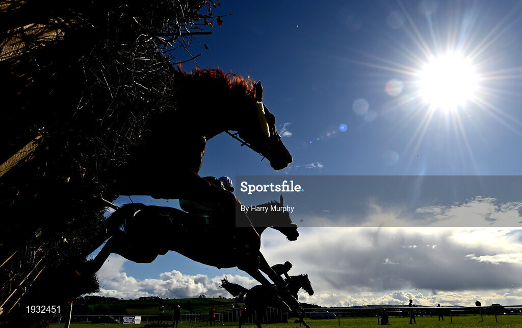 23 September 2020; Runners and riders jump the last during the Devon Inn Hotel Handicap Hurdle at Listowel in Kerry. Photo by Harry Murphy/Sportsfile