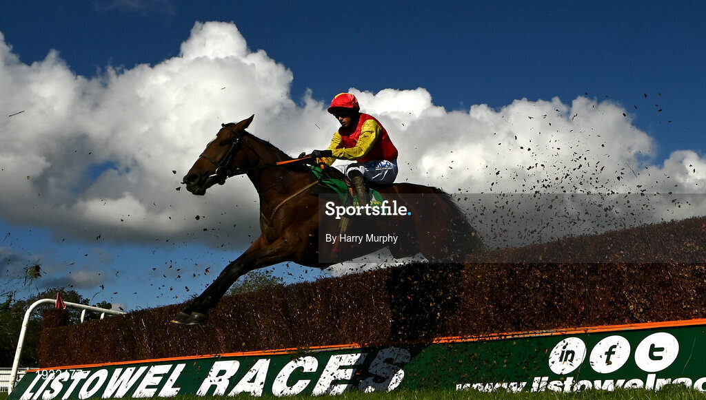 23 September 2020; Dime A Dozen, with Bryan Cooper up, jumps the last first time round during the Ballygarry House Hotel Mares Novice Steeplechase at Listowel in Kerry. Photo by Harry Murphy/Sportsfile