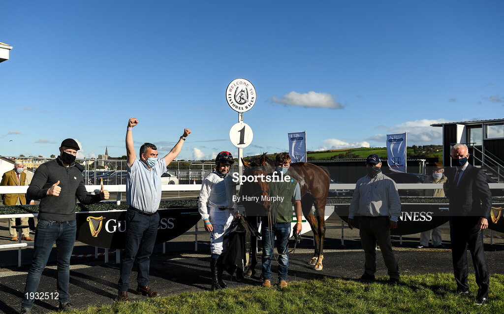 23 September 2020; Jockey Paul Townend, centre, with, Cabaret Queento, trainer Willie Mullins, right, Owner Jonathan O'Grady second from left, and winning connections after winning the Guinness Kerry National Handicap Steeplechase at Listowel in Kerry. Photo by Harry Murphy/Sportsfile