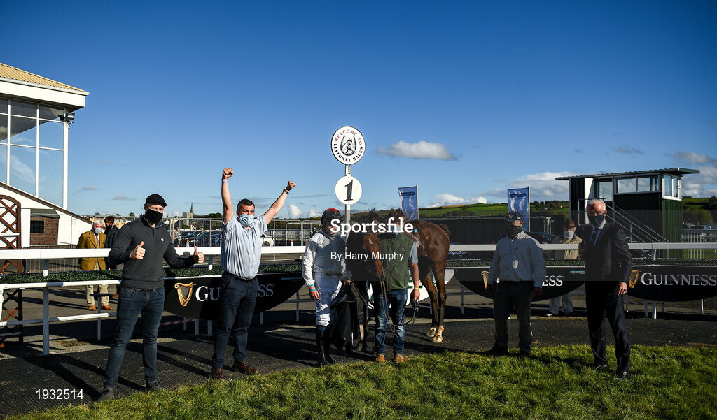 23 September 2020; Jockey Paul Townend, centre, with, Cabaret Queento, trainer Willie Mullins, right, Owner Jonathan O'Grady second from left, and winning connections after winning the Guinness Kerry National Handicap Steeplechase at Listowel in Kerry. Photo by Harry Murphy/Sportsfile