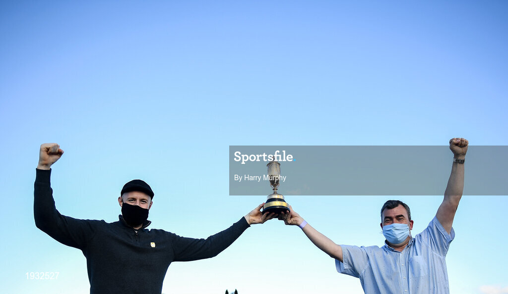 23 September 2020; Owner Jonathan O'Grady, right, with, Gearoid Sheehan, celebrate with the trophy after sending out Cabaret Queen to win the Guinness Kerry National Handicap Steeplechase at Listowel in Kerry. Photo by Harry Murphy/Sportsfile