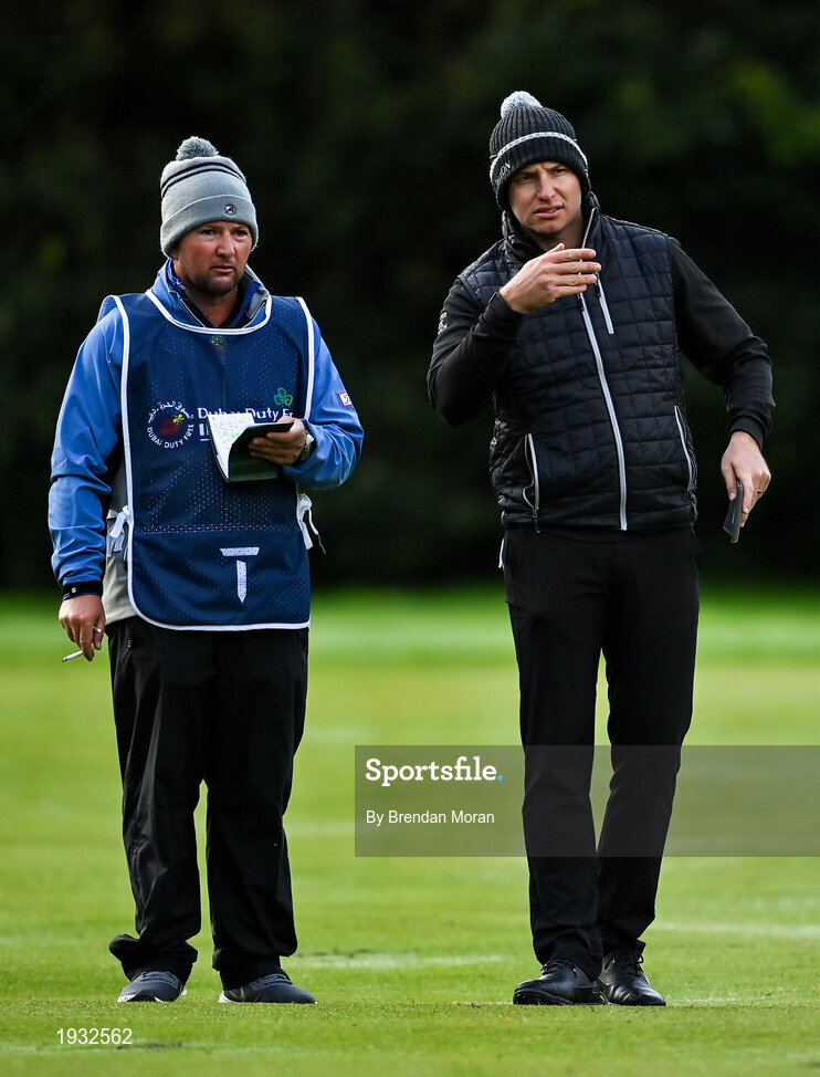 24 September 2020; Dean Burmester of South Africa checks the yardage with his caddie Jason Reynolds during day one of the Dubai Duty Free Irish Open Golf Championship at Galgorm Spa & Golf Resort in Ballymena, Antrim. Photo by Brendan Moran/Sportsfile