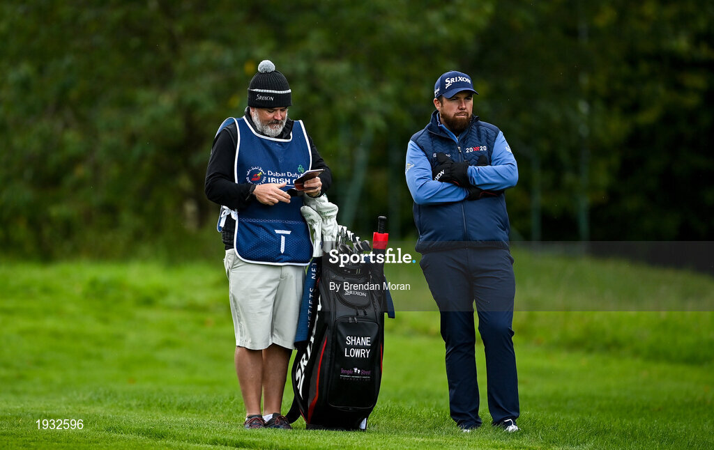 24 September 2020; Shane Lowry of Ireland awaits his turn on the sixth fairway, with his caddie Brian Martin, during day one of the Dubai Duty Free Irish Open Golf Championship at Galgorm Spa & Golf Resort in Ballymena, Antrim. Photo by Brendan Moran/Sportsfile